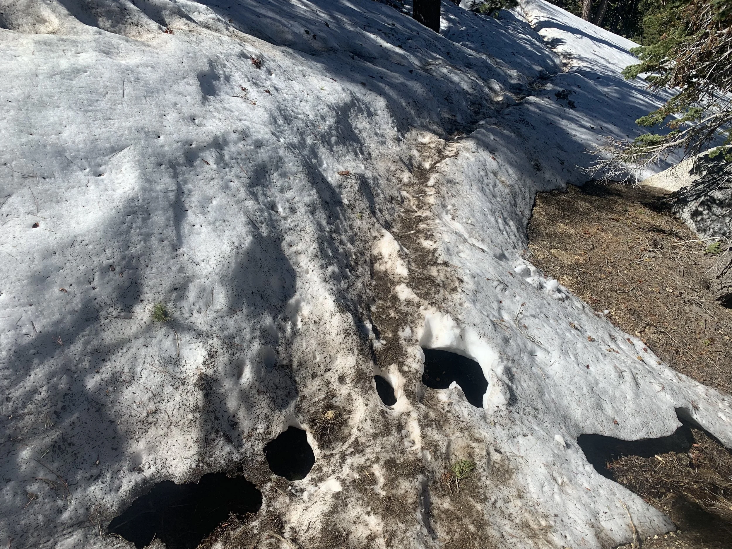 One good thing about the snow was the snow melt, more water sources! We came across quite a few little streams that weren’t registered on our Guthook app, this meant we could carry less water and be slightly more nimble across the water. The other thing about snow melt though was snow bridges, where snow forms a bridge over water. You have to be careful not to stand on these and they are weakened by the water flowing beneath.