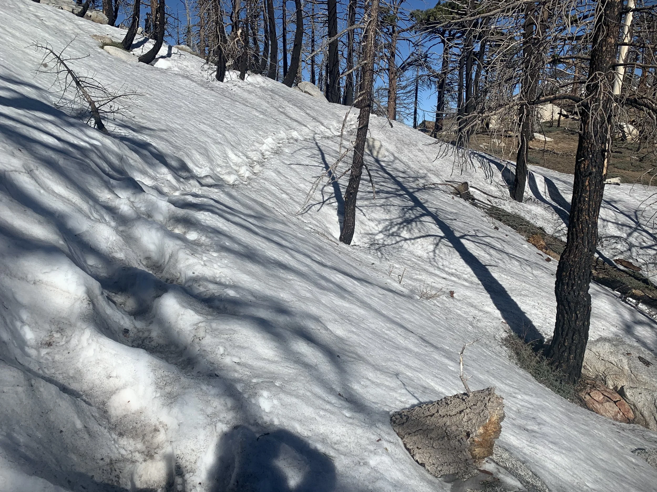 Miles and Matt has camped a few miles on from us so Shaker, (a young German who shook tents to wake people up but accidentally shook the wrong one once) and Claire and I headed off in the morning. We only had a few miles and had aimed to be at the junction to head down to Idyllwild by lunch time - we just hadn’t taken into account how much snow there would be and how long it would take us to pass! We were still a little shaken from Claire’s fall the day before so were keen to take it slow. Shaker agreed that we should just put our micro spikes on and not risk anything!